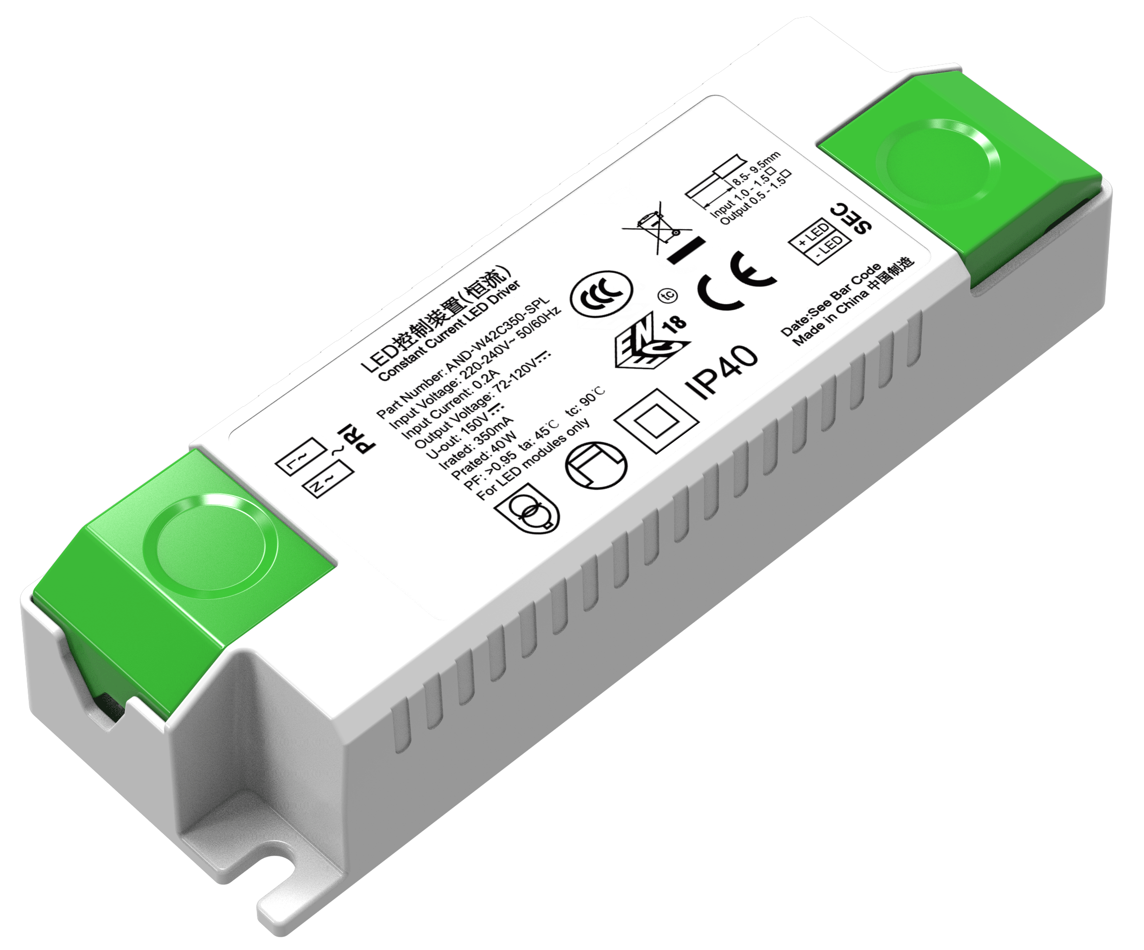 CE: EN61347-1:2008+A1:2011,EN61347-2-13:2006 TUV: EN61347-1/A1:A1:2011, EN61347-2-13:2006, EN62493:2010 CQC/CCC: GB 19510.14-2009 Surge: IEC/EN61000-4-5 |